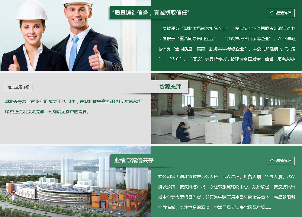 湖北興濤木業(yè)有限公司成立于2013年,在湖北咸寧嘉魚征地150畝新建廠房,公司立足于武漢地區(qū),業(yè)務輻射湖北及周邊地區(qū),多年來致力于木枋、模板批發(fā)業(yè)務,公司以“質(zhì)量鑄造信譽,真誠搏取信任”為宗旨,以多品種、低價格、優(yōu)質(zhì)量深受廣大客戶的青睞,是一家在木枋模板行業(yè)中處于優(yōu)秀地位的廠家。公司一度被評為“湖北市場知名企業(yè)”;在武漢企業(yè)信用報告組編活動中,被授于“重合同守信用企業(yè)”、“武漢市場信用示范企業(yè)”。2014年還被評為“全國質(zhì)量、信譽、服務AAA等級企業(yè)”。本公司所經(jīng)銷的“興濤”、“華升”“佰龍”等品牌模板,被評為全國質(zhì)量、信譽、服務AAA等級品牌模板。